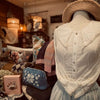 The Wednesday Shirt is made from a beautiful cotton voile and trimmed with a cotton lace. The exaggerated point collar is the feature of this shirt, complimented by the delicate pleating along the bodice. The cinched waist enhances your silhouette, making it the perfect match for our tutus and pants.