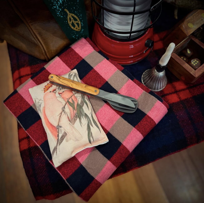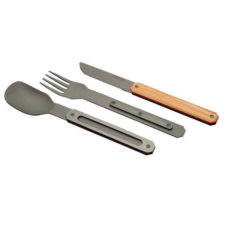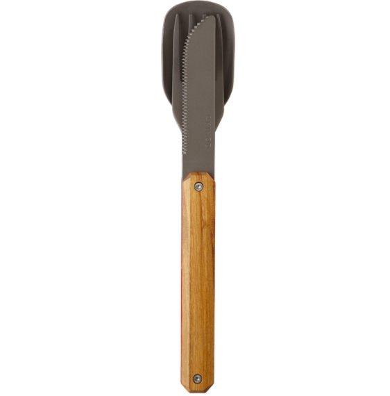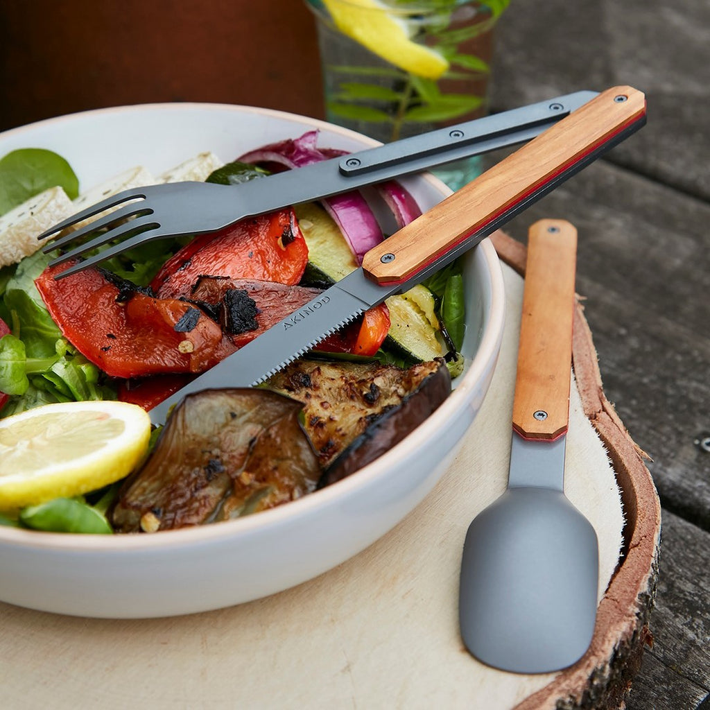 Cutlery in martensitic stainless steel 2CR14, dark grey titanium finish. Comprises a large spoon, a 4-pronged fork and a knife with a micro-serrated blade. Olive wood handle. Magnetic assembly.