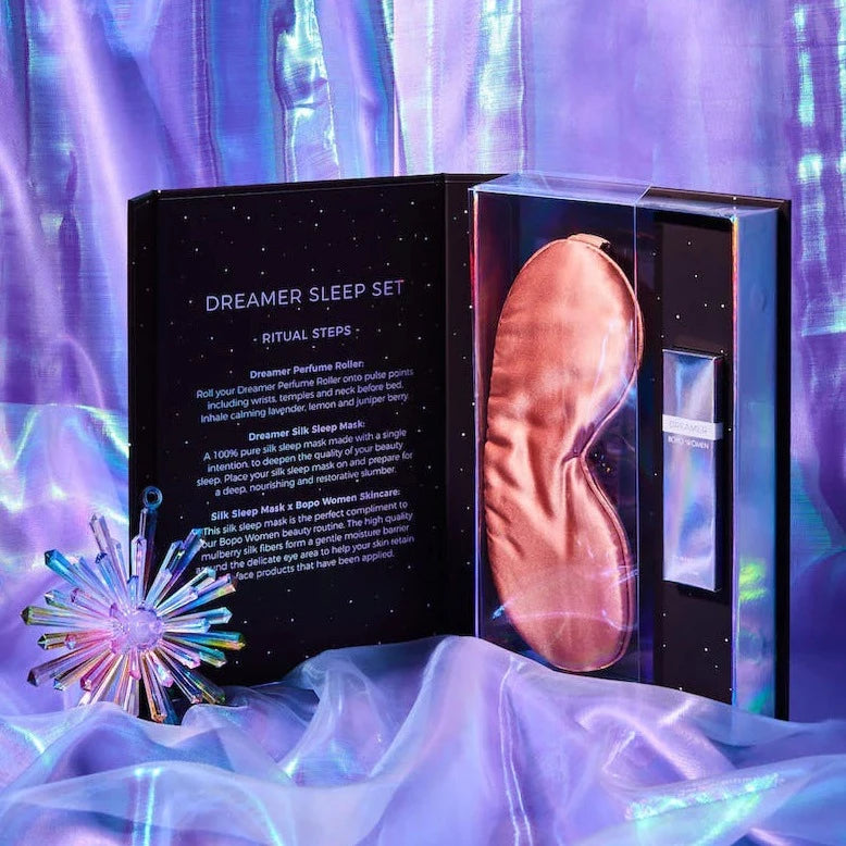 Sweet Dreams are made of this Sleep Set. Our Dreamer Serene Sleep Set pairs our beautiful Amethyst Infused roller Dreamer, blended to promote calm and deep sleep, with a beautiful 100% Silk Sleep Mask. Packaged in a gorgeous re-usable gift box to store all of your bedtime trinkets.