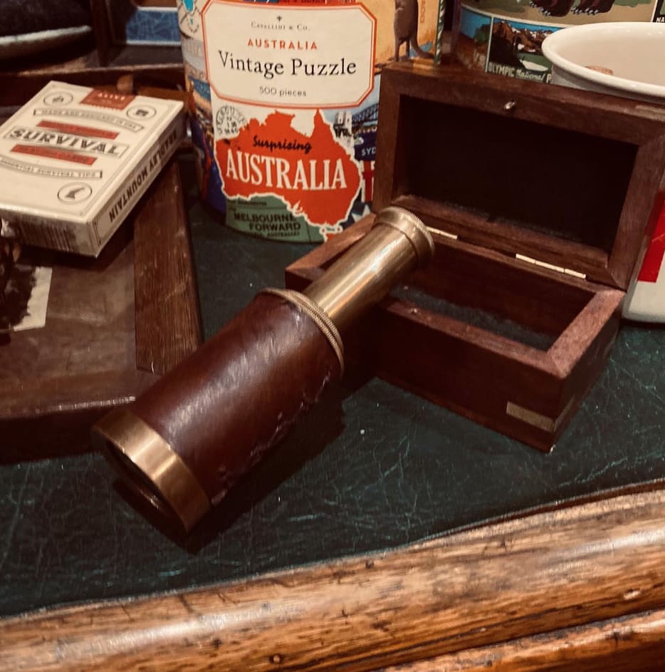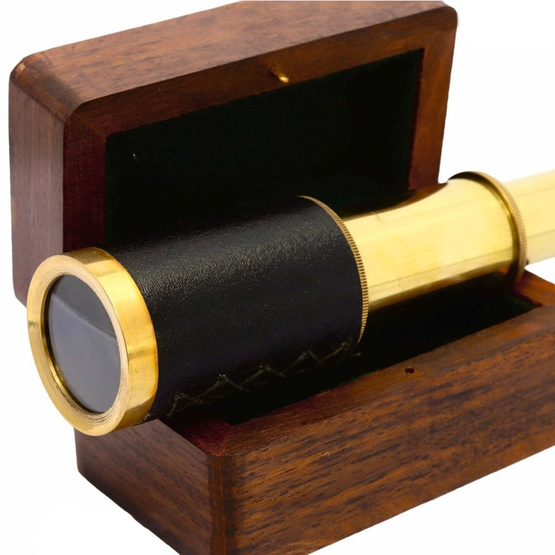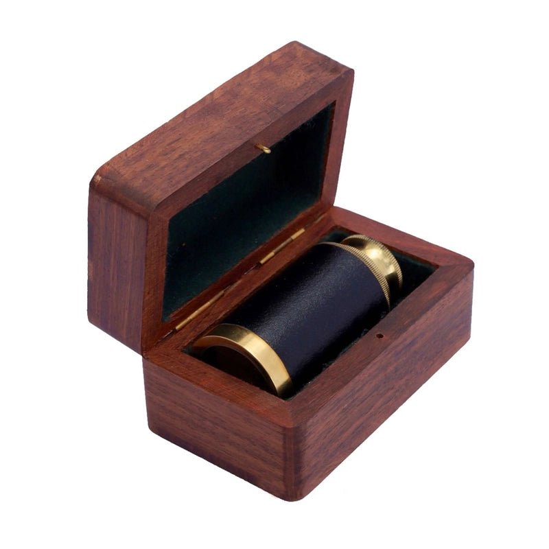 This pocket-sized, 2-draw, spyglass telescope is a little beauty! Fully functional and crafted from brass with a leather hand-grip, its perfect to take on walks and pirate adventures! When not in use it can be kept in its handcrafted recycled and treated mango wooden box.