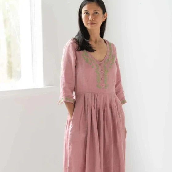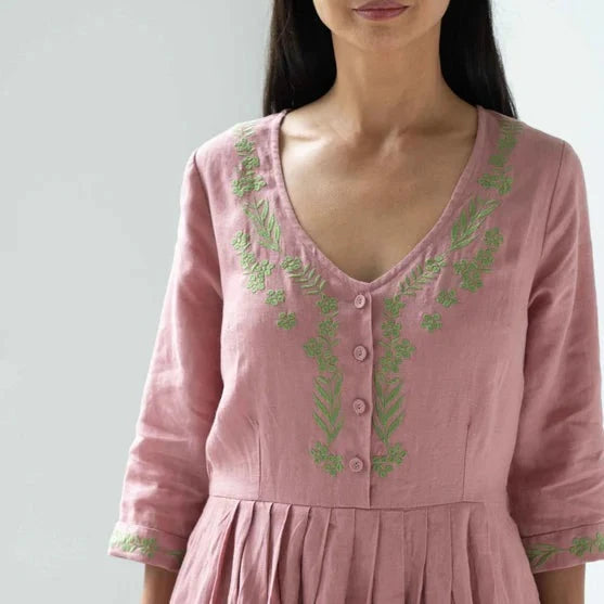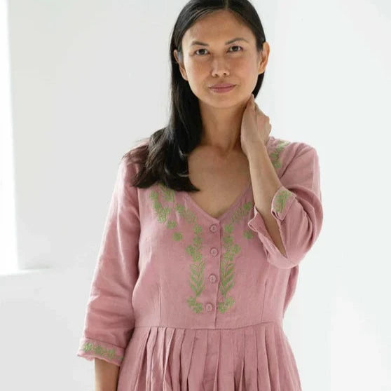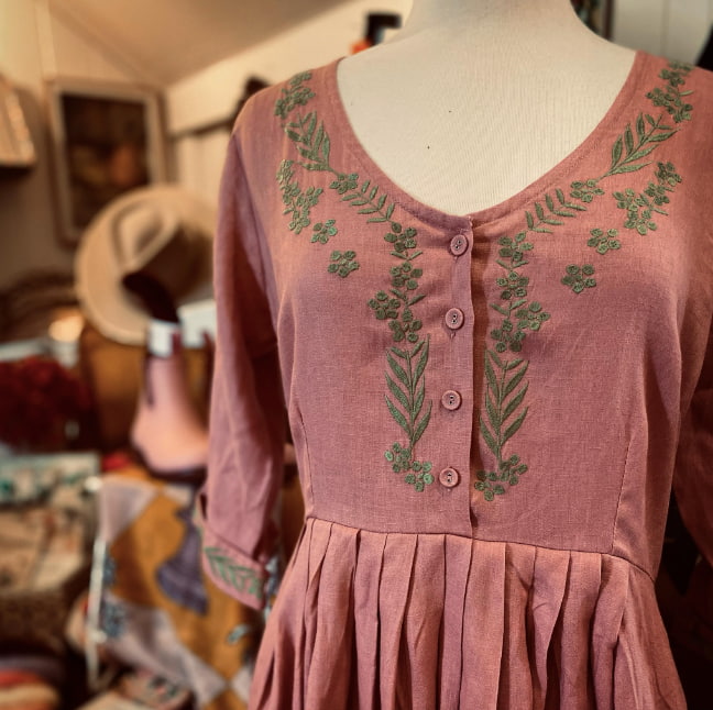 It is rose pink and has beautiful matte embroidery in a contrast green on the bodice and sleeve cuffs.