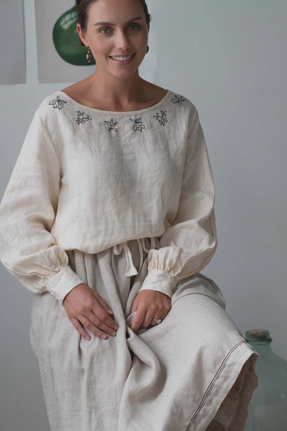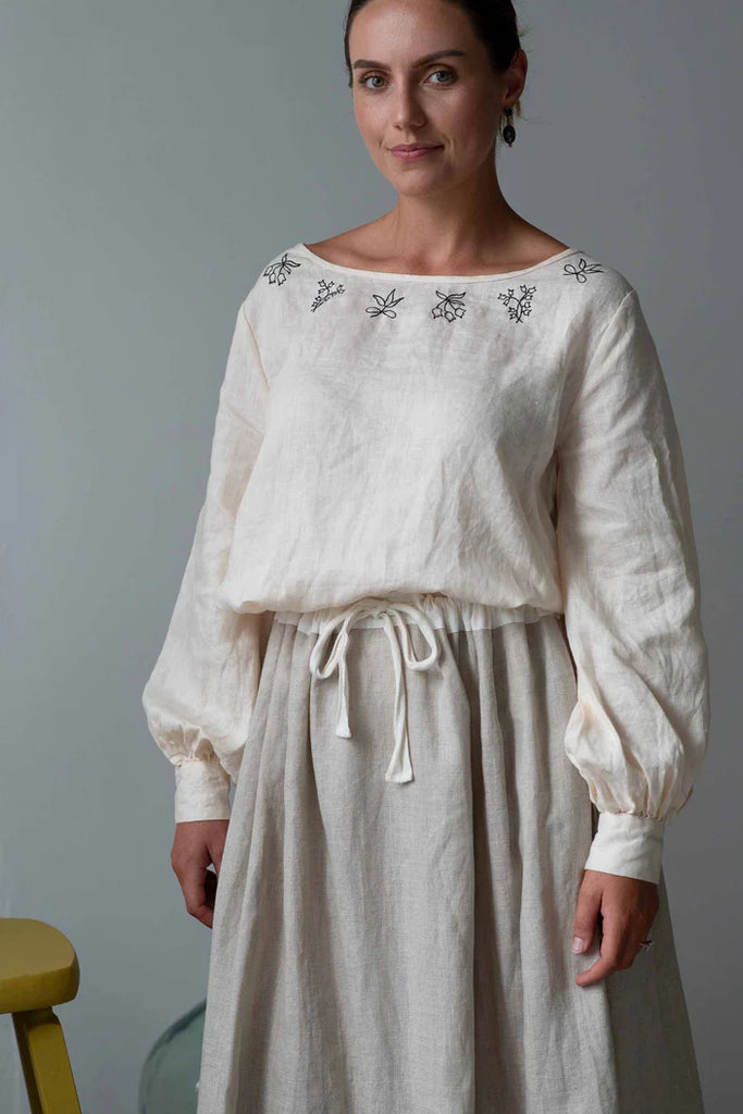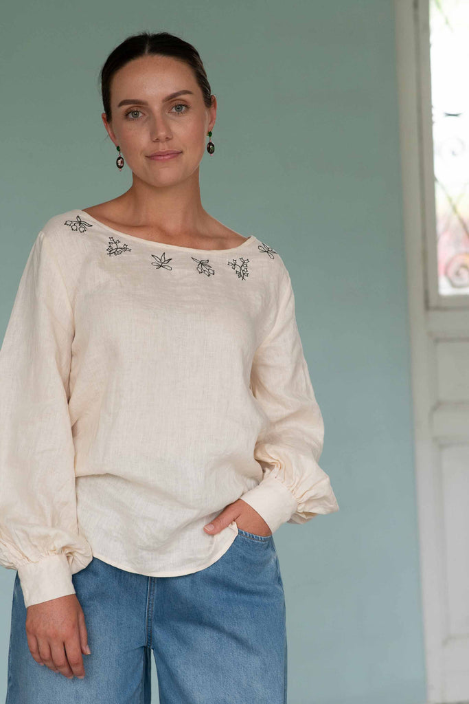 Valeria linen top in clotted cream with contrast dark charcoal embroidery around the front neckline.
